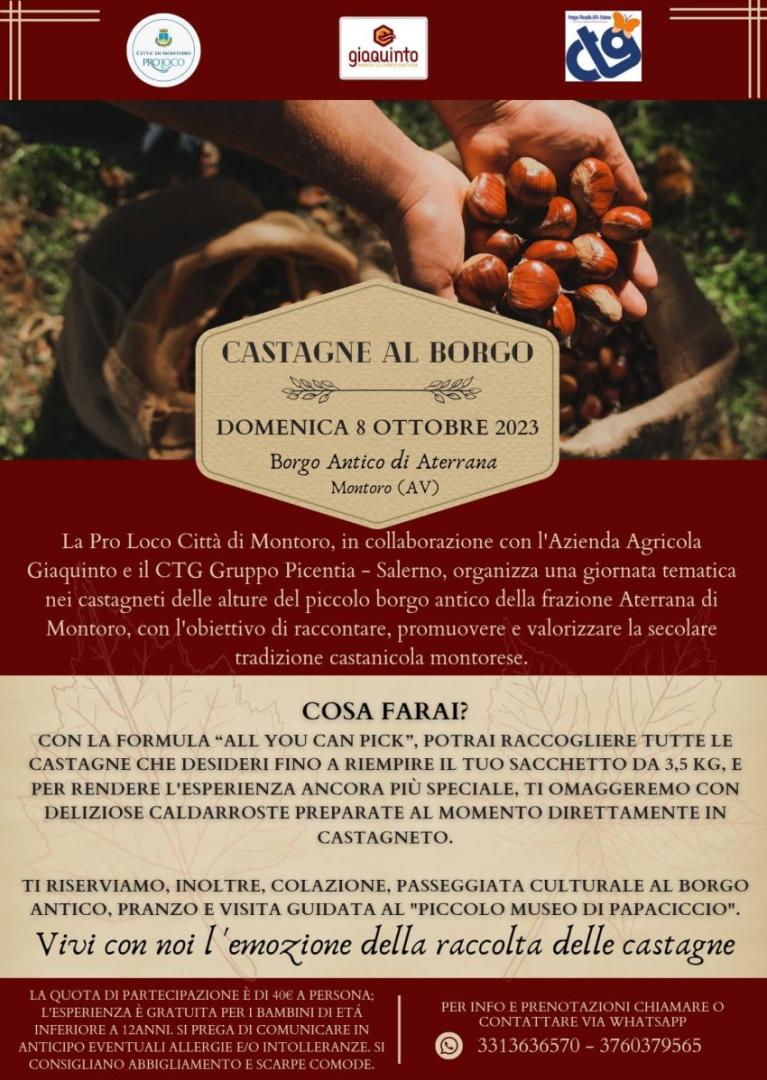 Domenica 8 ottobre, presso l’antico Borgo di Aterrana-Montoro (AV), la Pro Loco Città di Montoro, il Gruppo CTG Picentia di Salerno e l’Azienda Agricola Giaquinto, che hanno unito le proprie forze in un contributo, uno scambio di idee e pareri, organizzano l’iniziativa “Castagne al Borgo” per la valorizzazione della secolare tradizione castanicola montorese.