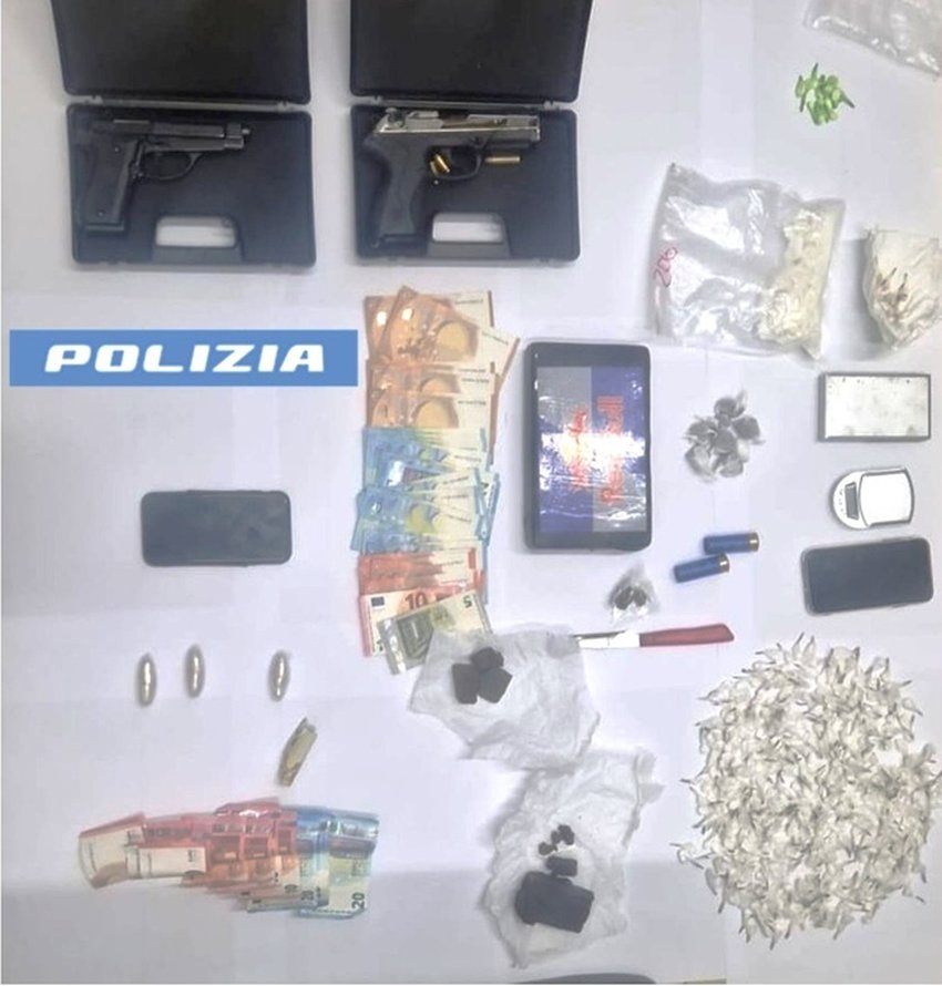 Ingenti le quantità di stupefacenti rinvenute: 1,3 kg di cocaina, in parte confezionata in oltre 400 dosi, 4 grammi di eroina, già pronta per essere spacciata, 180 grammi di hashish; inoltre, sono state recuperate 2 pistole scacciacani, di cui una modificata per renderla arma da fuoco (in canna una cartuccia calibro 9). I poliziotti, poi, hanno intercettato il 21enne mentre si recava presso il domiclio del 19enne: era in possesso di circa 30 grammi di eroina. Arrestato anche lui.