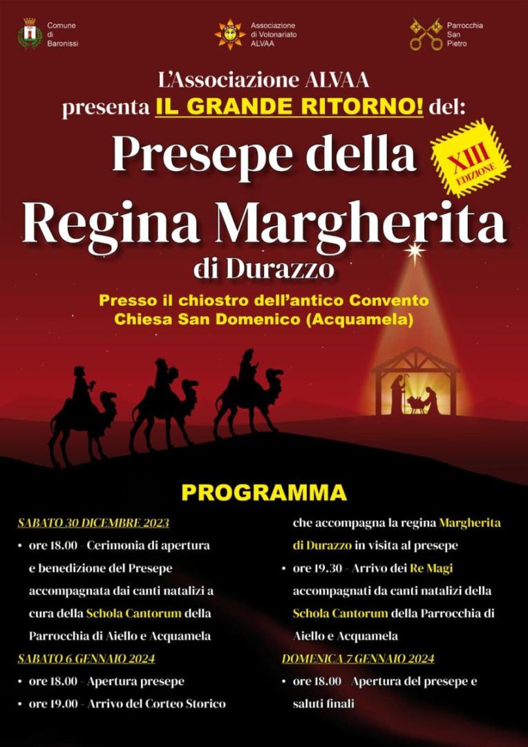 Sabato 30 dicembre, dalle ore 18:00, benedizione del Presepe accompagnata dai canti natalizi a cura della Schola Cantorum della Parrocchia di Aiello e Acquamela. Il 6 gennaio, arrivo del Corteo Storico che segue la regina Margherita di Durazzo in visita al presepe e, alle ore 19:30, arrivo dei Re Magi.