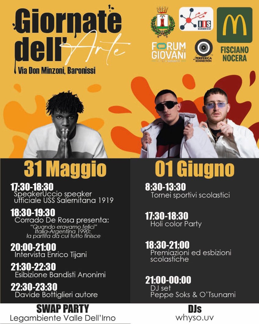 A Baronissi, il 31 maggio (17:30-23:30) e 1 giugno (8:30-00:00), arrivano le "Giornate dell'Arte". La manifestazione, promossa dal locale Forum dei Giovani e patrocinata dal Comune, si terrà in via don Minzoni. Un programma ricco di eventi, all'insegna di musica, spettacoli, sport e colori.