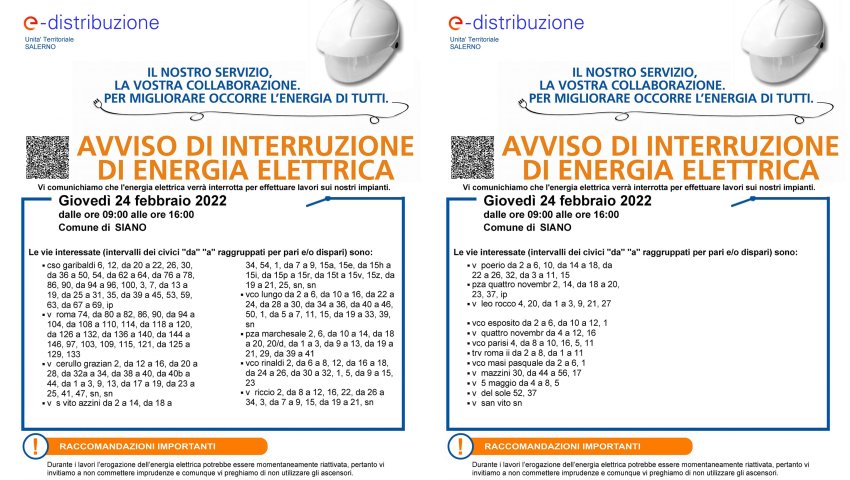 Il Comune di Siano, dopo avviso di e-distribuzione S.p.A., informa i cittadini che, a causa di lavori sugli impianti, l'erogazione dell'energia elettrica sarà interrotta in alcune zone del territorio nella giornata di Giovedì 24 Febbraio 2022 dalle 09:00 alle ore 16:00. Le zone interessate sono indicate nel volantino allegato.