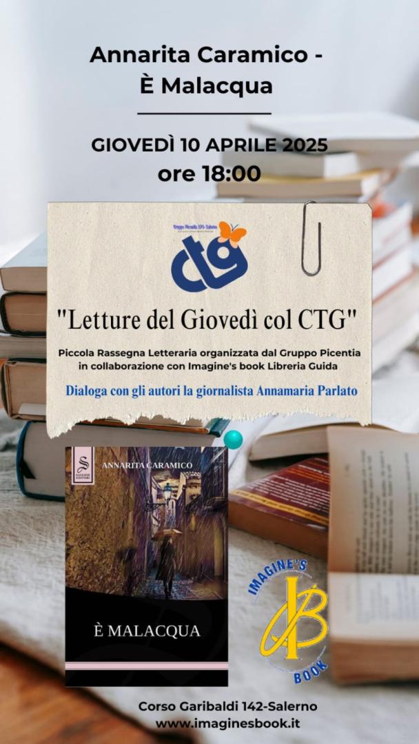 Presso "Imagine's book Libreria Guida", in corso Garibaldi a Salerno, il romanzo d'esordio della talentuosa scrittrice Annarita Caramico ("E' malacqua"), edito da Saggese Editori; si tratta del terzo appuntamento della piccola rassegna letteraria "Letture del Giovedì col CTG", in programma il 10 aprile alle ore 18:00. Modera l'appuntamento la giornalista Annamaria Parlato, direttore di Irno24.