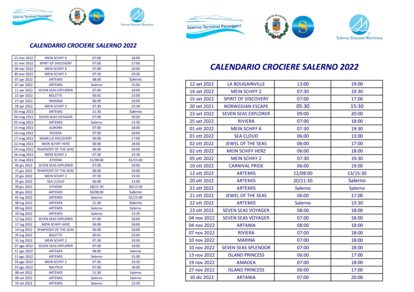 Già dal prossimo 21 marzo, Salerno è pronta ad accogliere l'arrivo di due navi contemporaneamente: la tedesca Mein Schiff 6 della Tui Cruises e la Spirit of Discovery dell'inglese Saga. La scelta di alcune compagnie, appartenenti al segmento luxury, di includere Salerno nel loro itinerario è una opportunità che la città deve saper cogliere. L'obiettivo è quello di creare la destinazione Salerno come meta ambita del turismo di lusso e dare consapevolezza alla città di questa sua futura veste".