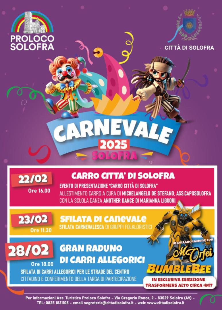 La Pro Loco di Solofra è lieta di annunciare l’edizione 2025 del Carnevale: tre giornate ricche di eventi, colori e tradizione, che sapranno coinvolgere grandi e piccini in un ideale palcoscenico di allegria e spettacolo. Il 23 febbraio, la presentazione del “Carro Città di Solofra”, un momento attesissimo che conferma la storicità e l’importanza della tradizione del carro nella città. L’allestimento è a cura di Michelangelo De Stefano (associazione CapoSolofra), con la partecipazione della scuola di danza Another Dance di Marianna Liguori.