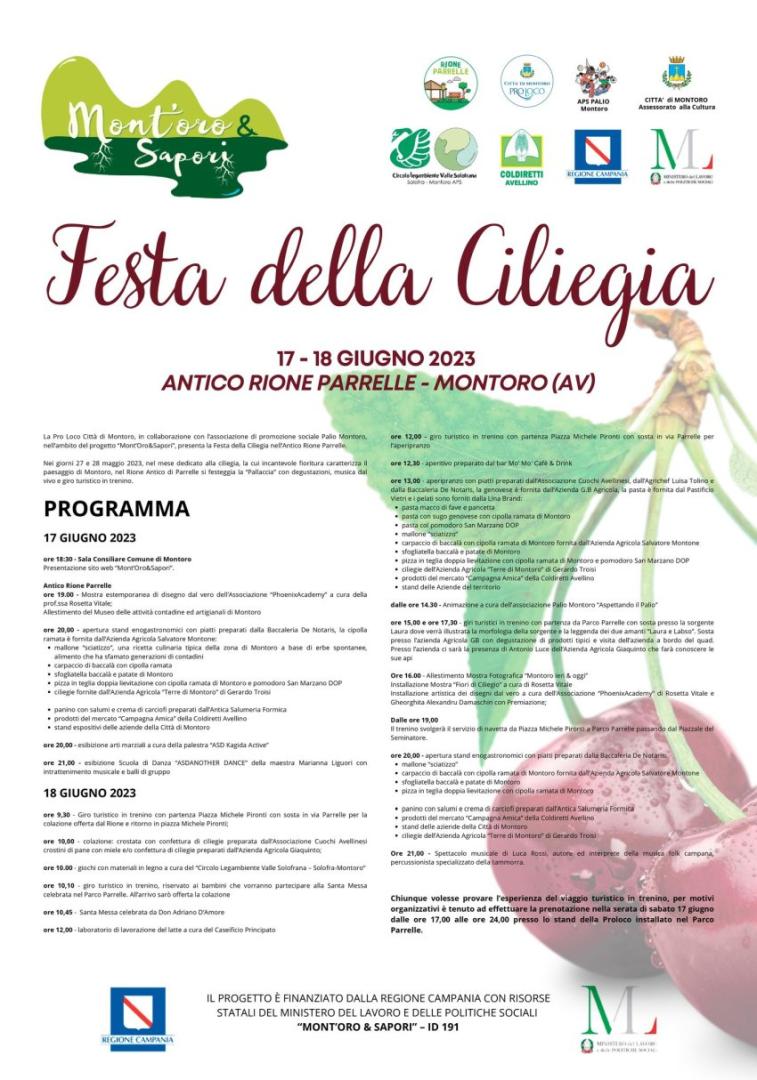 Nel fine settimana 17-18 giugno, Festa della Ciliegia nell'antico Rione Parrelle di Montoro. L'evento è organizzato dalla Pro Loco, in collaborazione con l'associazione Palio Montoro. Stand gastronomici operativi dalle ore 20:00. In programma anche convegni ed esibizioni musicali dal vivo.