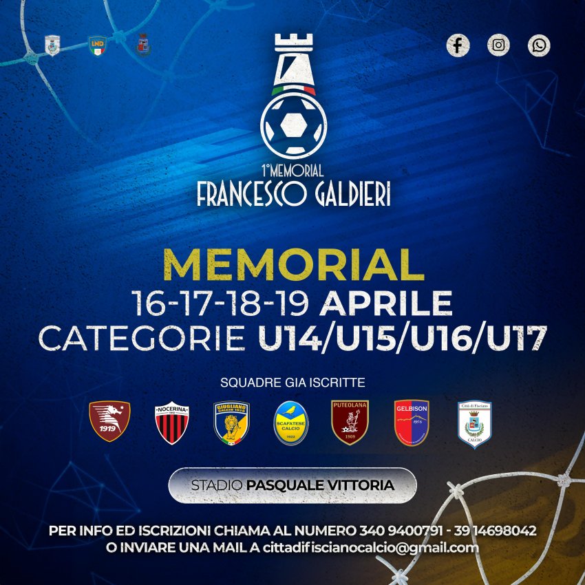 Un week-end di Pasqua all’insegna del calcio giovanile, nel ricordo di uno dei più grandi imprenditori di Fisciano, stimato ed apprezzato anche al di fuori dei confini territoriali: il 16-17-18-19 Aprile 2025, presso lo Stadio Comunale “Vittoria” di Fisciano, si terrà il Primo Memorial Francesco Galdieri, per mantenere vivo il ricordo di don Ciccio, una delle più importanti personalità del mondo imprenditoriale, fondatore della “Galdieri Auto” e della “Galdieri Petroli”.