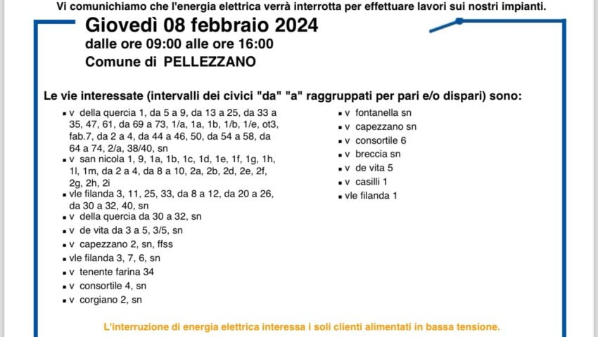 Giovedì 8 febbraio sono in programma lavori sugli impianti da parte della società E-distribuzione