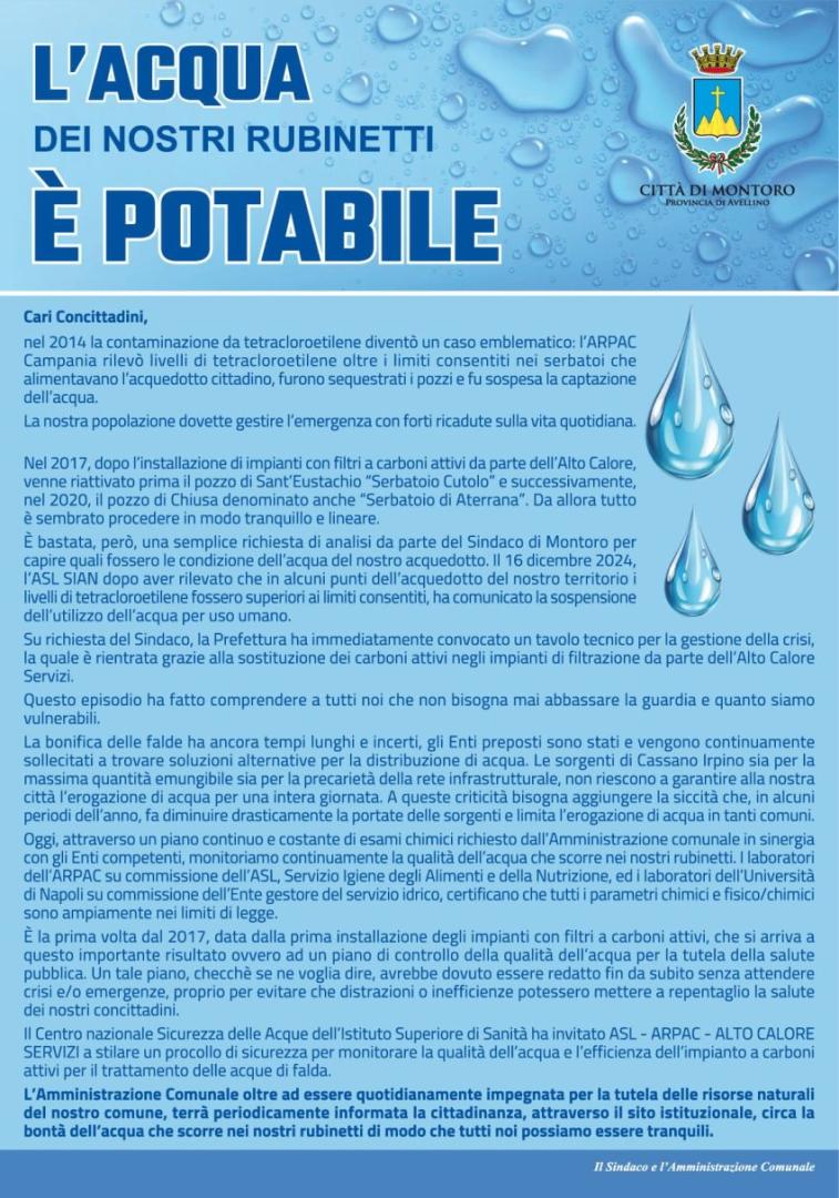 L'acqua a Montoro è potabile, un manifesto del Sindaco per rassicurare