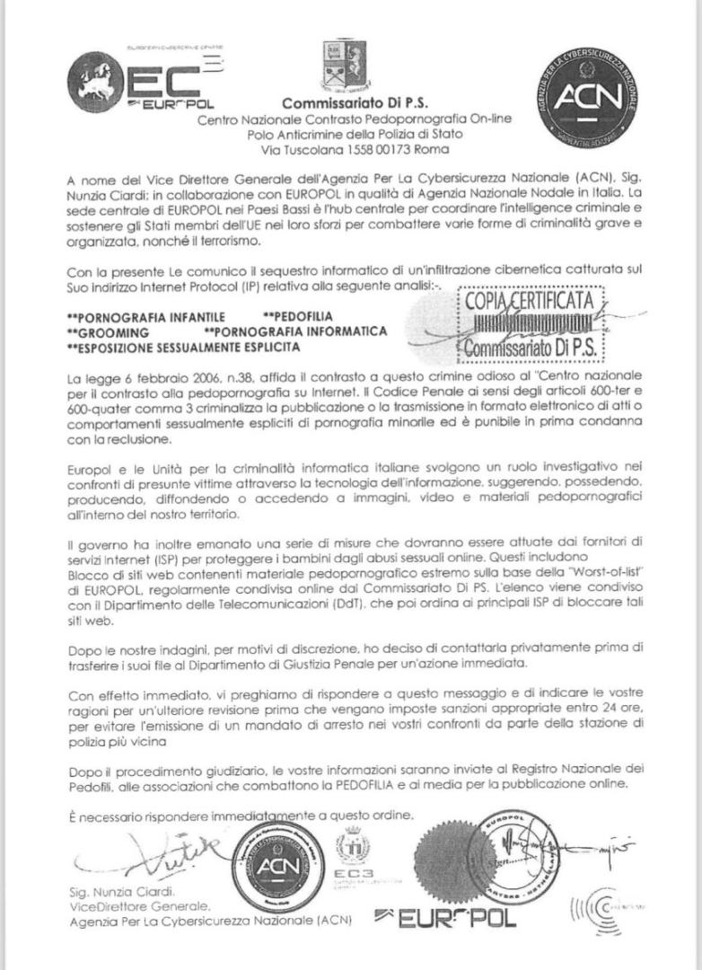La Polizia Postale ricorda che nessuna Forza di Polizia, o altra Autorità dello Stato, contatta i cittadini, tramite mail o messaggi, per richiedere chiarimenti su presunte condotte criminali. È in corso una campagna di phishing che cita e utilizza i loghi di Uffici e Centri Nazionali di Polizia di Stato, Europol e Agenzia per la Cybersicurezza, al fine di indurre la vittima a credere di essere stata indagata per pedopornografia, invitandola a fornire giustificazioni entro 48 ore, pena l’arresto. Lo scopo della truffa è carpire dati personali per scopi illeciti.