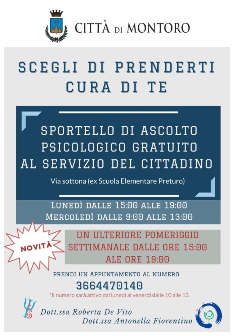 Date le numerose richieste pervenute, l'Amministrazione Comunale di Montoro mette a disposizione del cittadino un'ulteriore apertura pomeridiana dello Sportello d'Ascolto Gratuito, ubicato in Via Sottana (ex scuola elementare Preturo). L'Amministrazione e le dottoresse dello Sportello (De Vito-Fiorentino) ringraziano quanti ripongono in essi la loro fiducia. Informazioni nella locandina in basso.
