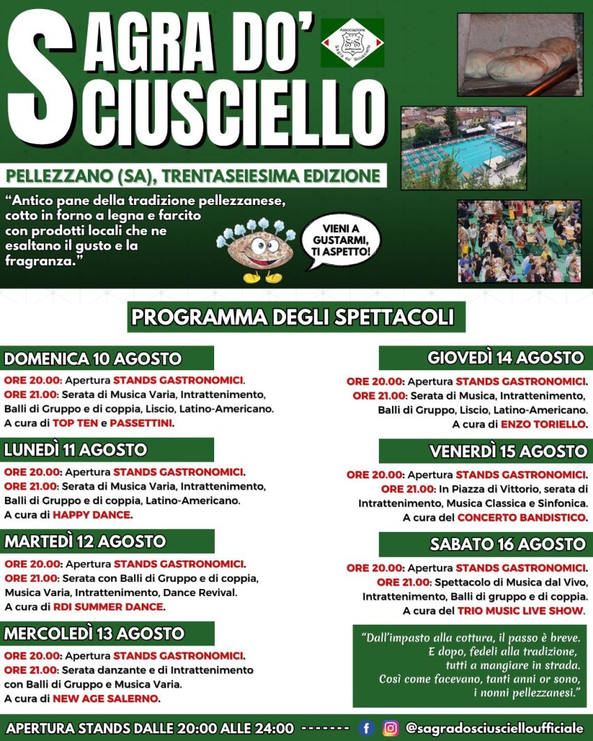 Dal 10 al 16 Agosto 2025, Pellezzano accoglie la storica Sagra del Sciusciello (36esima edizione). "E' il simbolo di una tradizione senza tempo - commenta il sindaco Morra - che affonda le radici nella sua terra di origine e nei sentimenti di coloro che di questa ricorrenza ne hanno voluto costruire un emblema identitario.