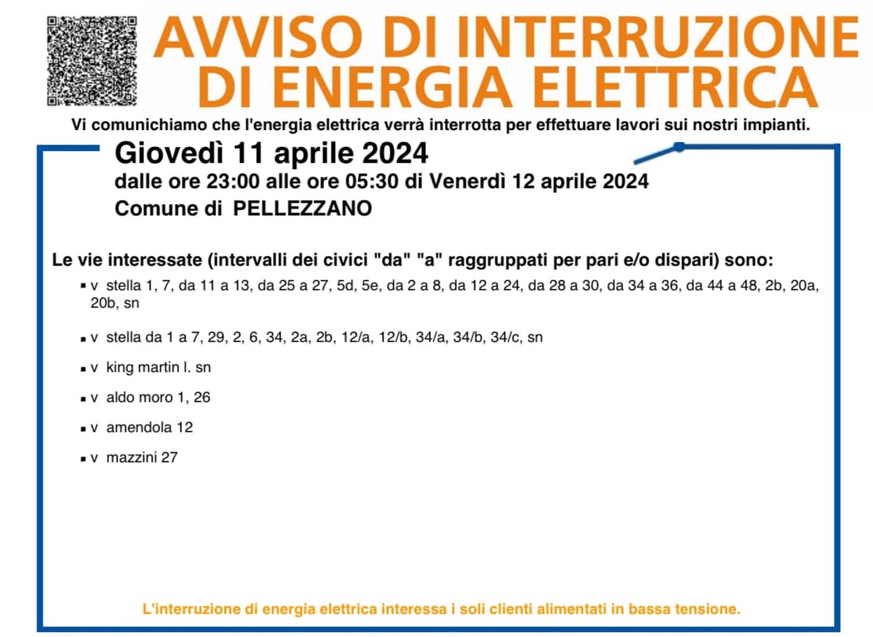 E-distribuzione comunica che, per effettuare lavori sugli impianti, verrà interrotta l'energia elettrica in alcune zone del territorio di Pellezzano (relativamente all'utenza in bassa tensione) dalle 23:00 di giovedì 11 aprile alle 5:30 di venerdì 12. Nella locandina in basso vengono indicate le strade interessate.