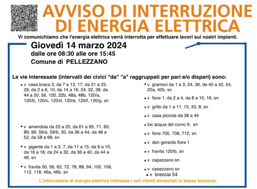 Tramite la propria pagina social istituzionale, il Comune di Pellezzano fa sapere che diverse zone del territorio saranno interessate, giovedì 14 marzo, dalle 8:30 alle 15:45, da un'interruzione di energia elettrica, conseguente ai lavori che E-distribuzione dovrà effettuare sui propri impianti.