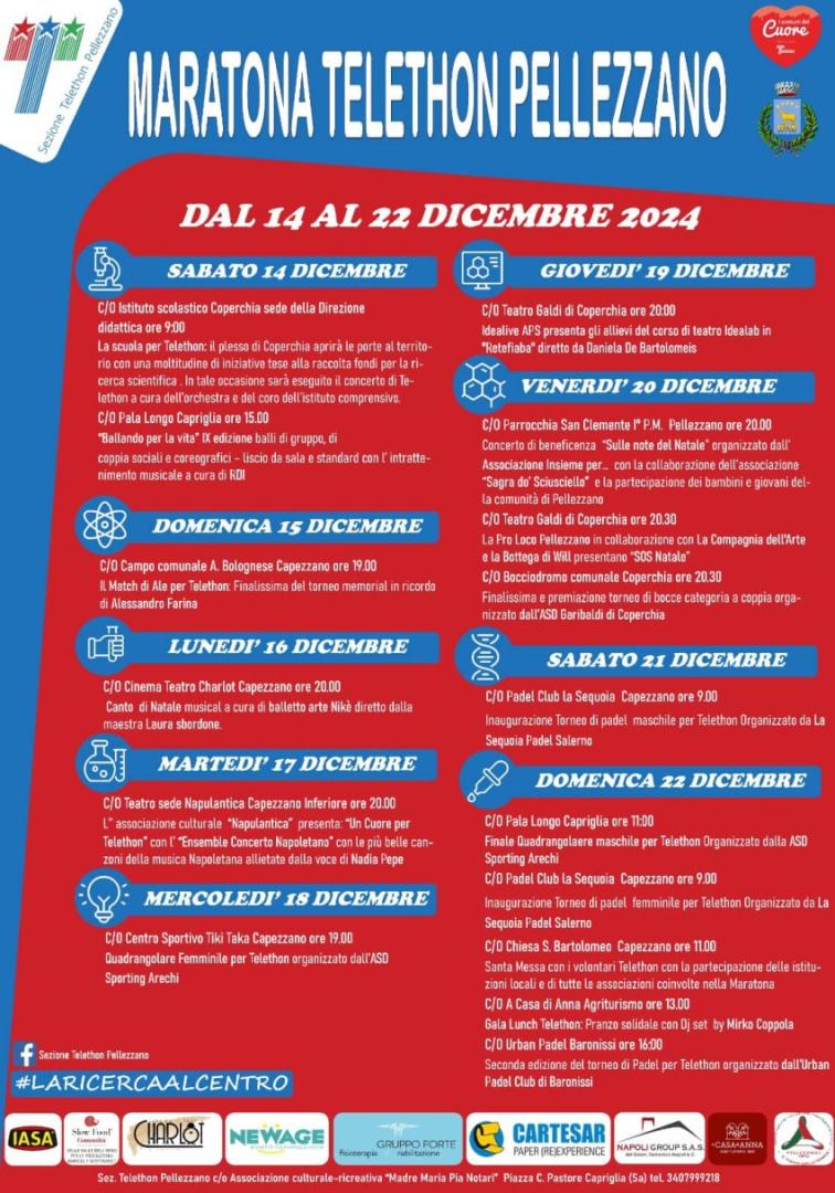 "Presentato, stamattina, presso il Comune di Pellezzano, il programma dell’edizione 2024 di Telethon. Un appuntamento diventato ormai consuetudine sul nostro territorio. L’intera Cittadinanza e il Comune di Pellezzano, anche quest’anno, sono in prima linea per la maratona Telethon, la cui inaugurazione ufficiale avverrà sabato 14 dicembre con gli alunni delle scuole, che saranno protagonisti nell’ambito del “mercatino solidale”.