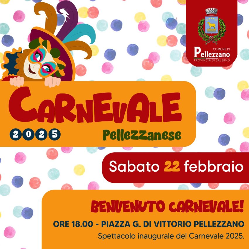 Pronti via. Il "Benvenuto Carnevale", in programma sabato 22 febbraio, alle ore 18:00, in Piazza G. Di Vittorio, a Pellezzano Capoluogo, si alza il sipario sull'edizione 2025 del Carnevale Pellezzanese. "Unisciti a noi - scrive il Comune sui social - per vivere lo spettacolo inaugurale con una serata piena di colori, musica e divertimento".