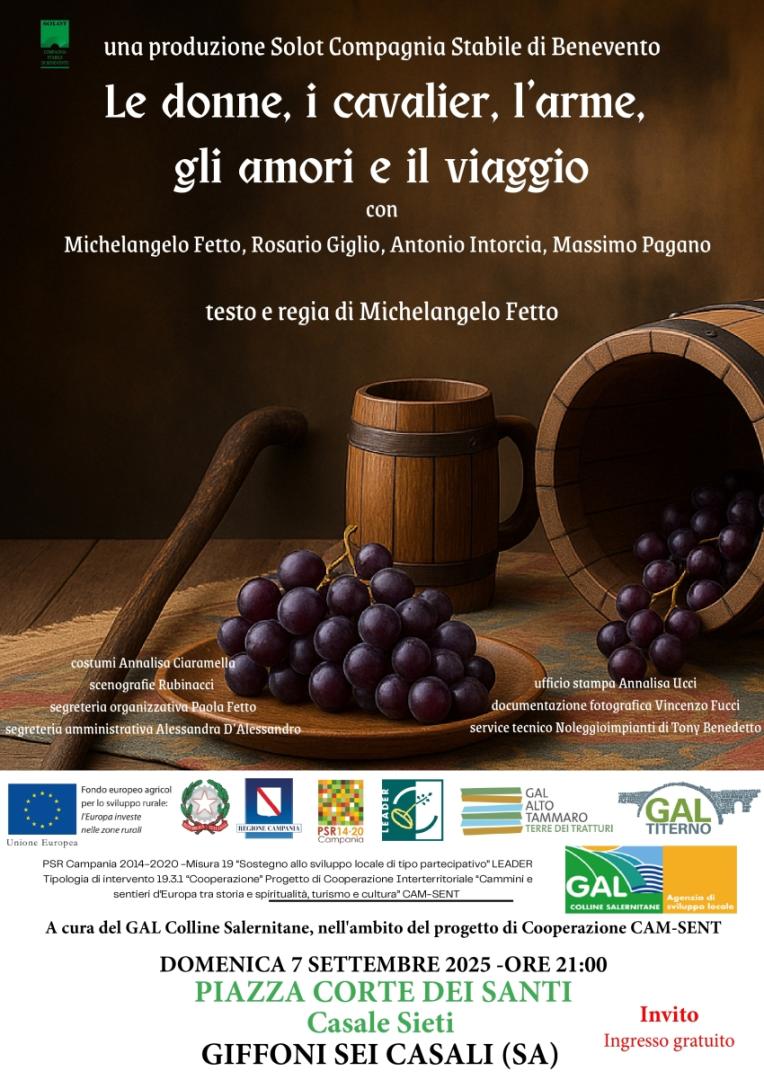 Il laboratorio, a cura della Compagnia Salot di Benevento, metterà in scena lo spettacolo itinerante dal titolo "Le donne, i cavalieri, l’arme, gli onori e il villaggio", domenica 7 settembre 2025, alle ore 21:00, al Casale Sieti di Giffoni Sei Casali, in Piazza Corte dei Santi (ingresso gratuito).