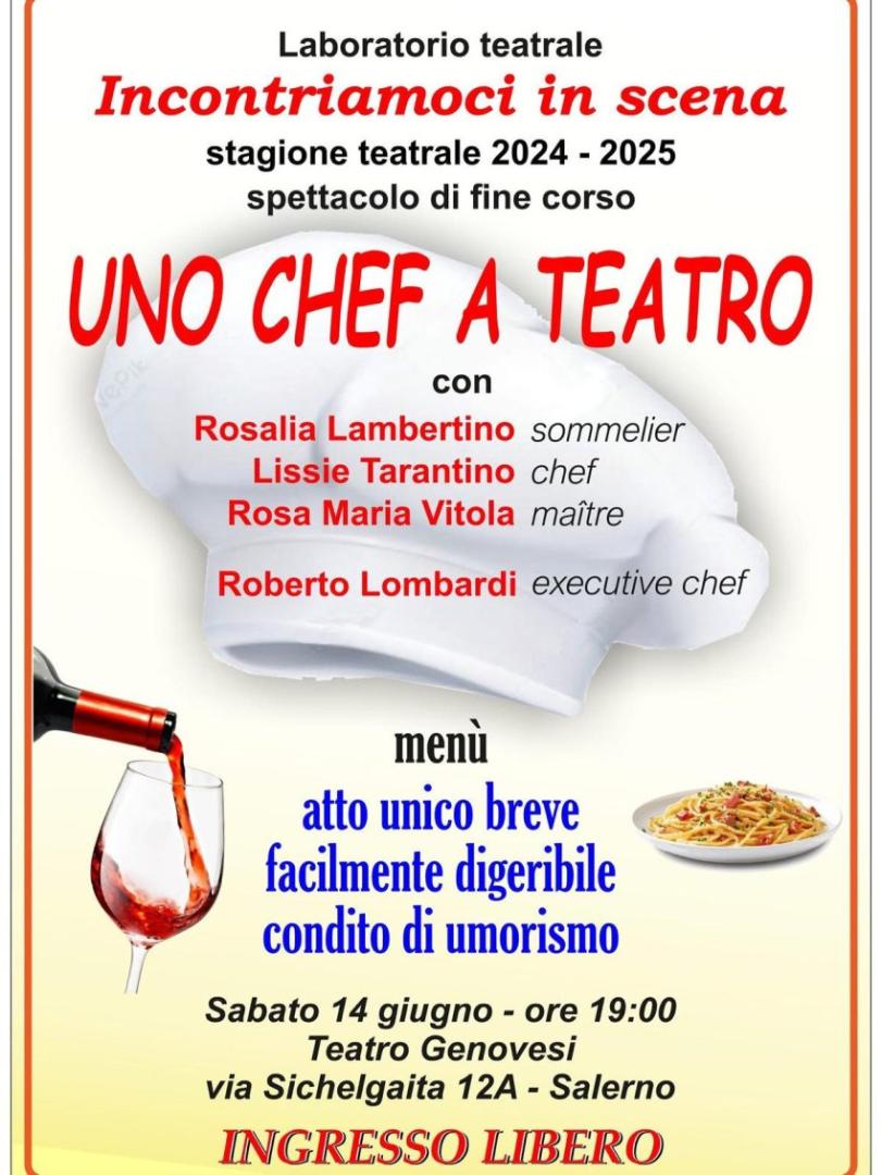 "Uno chef a teatro", sabato 14 giugno alle 19:00, è il saggio spettacolo di chiusura del laboratorio teatrale "Incontriamoci in scena", a cura di Roberto Lombardi, che si tiene ormai da tre lustri presso il teatro Genovesi a Salerno. I partecipanti non sono né aspiranti attori e tanto meno cuochi, piuttosto un gruppo di persone che intorno al teatro ha costruito un gioco serio quanto impegnativo.
