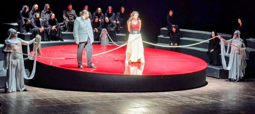 Allestimento dal forte impatto visivo, con scenografia circolare a richiamare l’arena dei toreador
