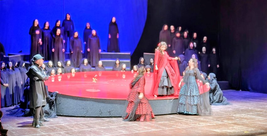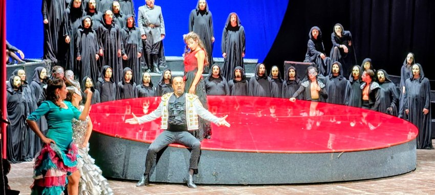 Allestimento dal forte impatto visivo, con una scenografia circolare a richiamare l’arena dei toreador, dove i protagonisti vivono la loro storia sotto lo sguardo del popolo. Una Carmen piena di luce e di colori musicali, esaltati dalla direzione appassionata del Maestro Oren. Raffinata ed elegante la regia di Plamen Katrtaloff, profondo conoscitore della macchina teatrale.