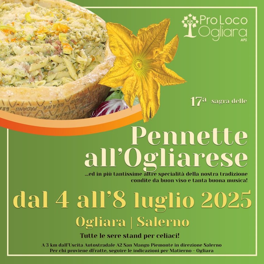 La Pro Loco di Ogliara, rione collinare di Salerno, annuncia la 17esima edizione della Sagra delle Pennette all'Ogliarese, che si terrà dal 4 all'8 luglio 2025. Oltre alla pietanza "centrale", tante specialità della tradizione (pizzelle ai fiori di zucca, melanzane allardate, caponata) accompagnate da vino locale e buona musica. Ogni sera, stand per celiaci.