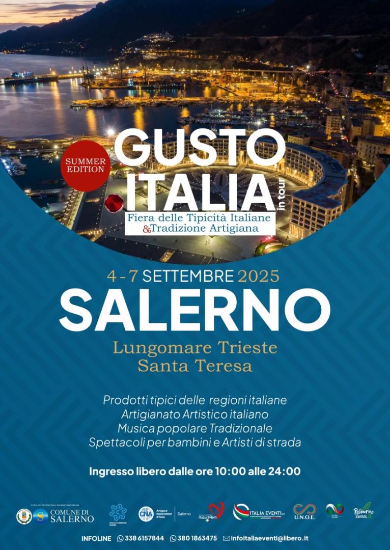 Quattro giorni, una squadra di artigiani e produttori provenienti da tutto il centro Sud Italia, artisti di strada e musicisti: sono i principali ingredienti dell’edizione estiva 2025 di Gusto Italia a Salerno. Da giovedì 4 a domenica 7 settembre, il Lungomare Trieste si vestirà a festa e, dalle ore 10:00 a mezzanotte, sarà possibile godere del mercatino e di un calendario di eventi adatto a tutta la famiglia. Con ingresso libero e gratuito a tutte le attività, questa tappa è promossa dalla CNA di Salerno, con il patrocinio della Camera di Commercio di Salerno, del Comune di Salerno e dell’Unione Nazionale Organizzatori di Eventi.