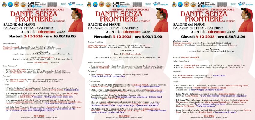 Dal 2 al 4 dicembre 2025, a Salerno, si svolgerà la X edizione del festival nazionale "Dante senza frontiere", diretto dal prof. Massimo Arcangeli e dalla prof.ssa Pina Basile, organizzato dalla Società "Dante Alighieri" Comitato di Salerno. Nel Salone di Marmi di Palazzo di Città un'immersione culturale nei canti tematici della Divina Commedia, una maratona dantesca che coinvolgerà 12 scuole, con la presenza di ben 250 studenti.