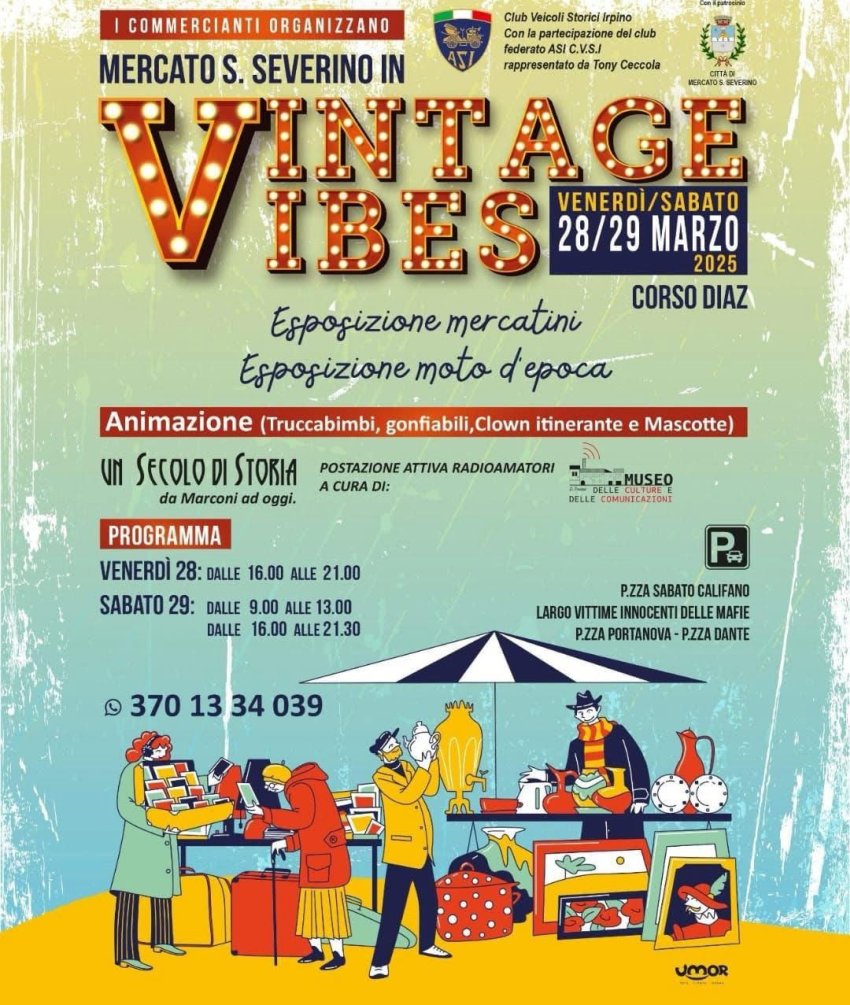 Mercato San Severino riscopre il gusto per il vintage e lo fa con una due giorni - venerdì 28 e sabato 29 marzo in Corso Diaz - all’insegna dei mercatini d’antiquariato e delle moto d’epoca. L’iniziativa, promossa dai commercianti, con il patrocinio del Comune di Mercato San Severino, rispolvera il profumo dell’antico, dei pezzi rari, anche da collezione. L’appuntamento è dalle 16:00 alle 21:00 di venerdì 28, mentre per sabato 29 il vintage si fa in due con una finestra di mattina, dalle 9:00 alle 13:00, ed un’altra di pomeriggio, dalle 16:00 alle 21:30.