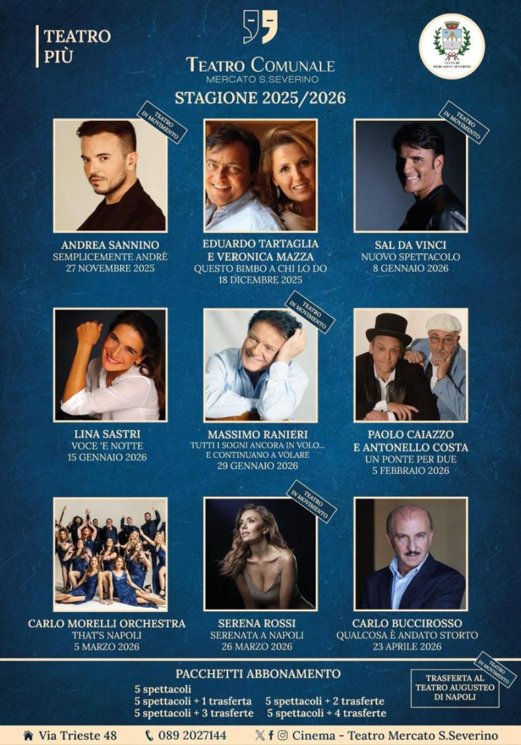 La nuova stagione artistica del Teatro Comunale di Mercato San Severino, con la direzione di Giuseppe Caccavale e Roberta Starace Caccavale, riparte da Andrea Sannino: lo farà il 27 novembre 2025 con la prima serata di un lungo tour, diviso tra la struttura sanseverinese e l’Augusteo di Napoli, destinato a chiudersi il 23 aprile 2026 con Carlo Buccirosso. Gli spettacoli di Sannino, Sal Da Vinci, Massimo Ranieri e Serena Rossi prevedono la "trasferta" partenopea. Tutti i dettagli nella locandina in basso.