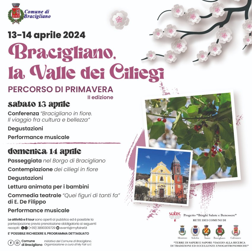 Nel fine settimana 13-14 aprile, un percorso per la creazione e la valorizzazione della Bracigliano Experience, attraverso un tour culturale ed enogastonomico alla scoperta dell'autenticità dei luoghi e delle tradizioni. Tutti e dettagli dell'evento "La Valle dei Ciliegi", edizione 2024, sono riportati nella locandina integrale in basso.