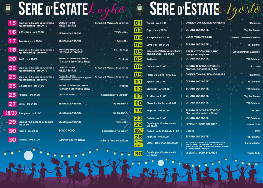 Ricco programma di eventi a Mercato San Severino, stilato dall'Amministrazione Comunale per i mesi estivi di Luglio e Agosto (locandina in basso). Già allestito un cartellone anche per Settembre. Serate danzanti, concerti, giochi ed altri appuntamenti animeranno il capoluogo e le frazioni. La gran parte degli spettacoli avrà inizio a partire dalle ore 21:00.