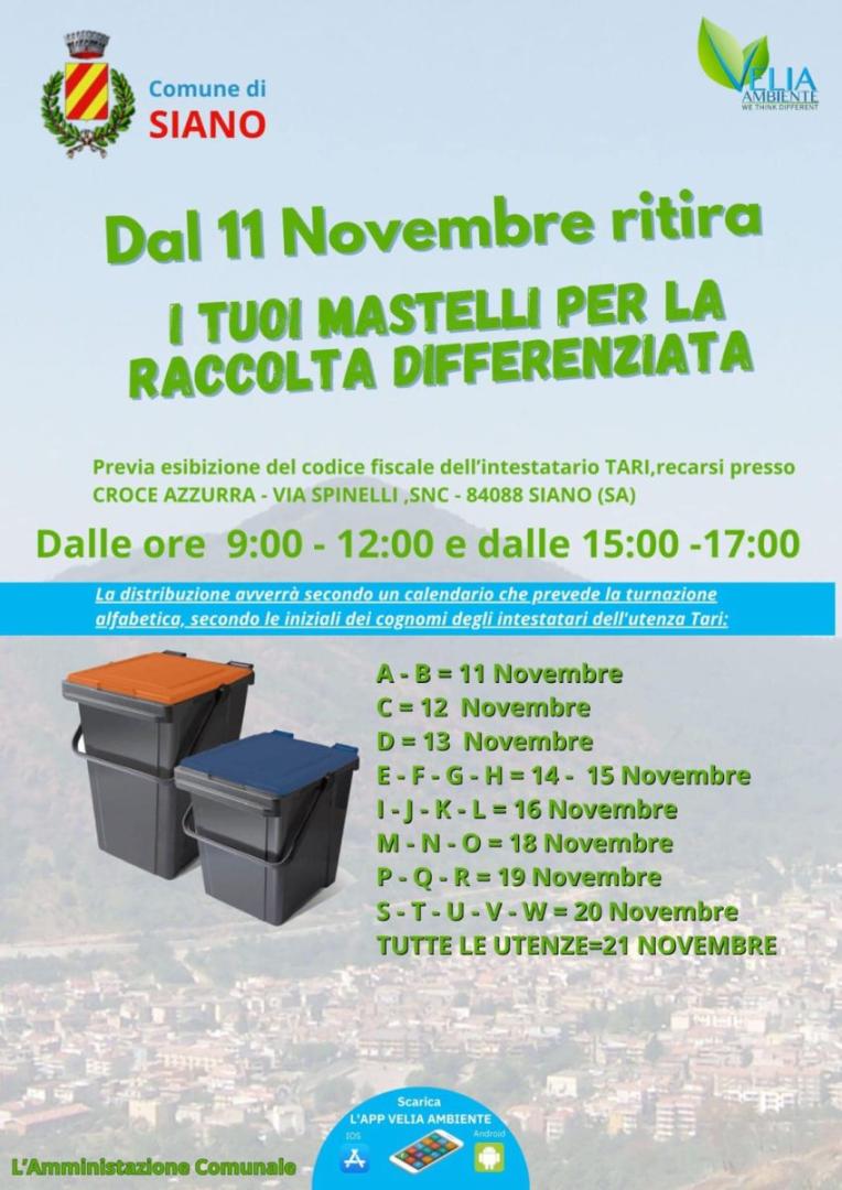Da lunedì 11 novembre, a Siano, presso la sede della Croce Azzurra di via Spinelli (9:00-12:00 e 15:00-17:00), saranno disponibili i mastelli per la raccolta differenziata. Per il ritiro, basato su un calendario a turnazione alfabetica (dettagli nella locandina in fondo alla pagina), è necessario esibire il codice fiscale dell'intestatario della TARI.
