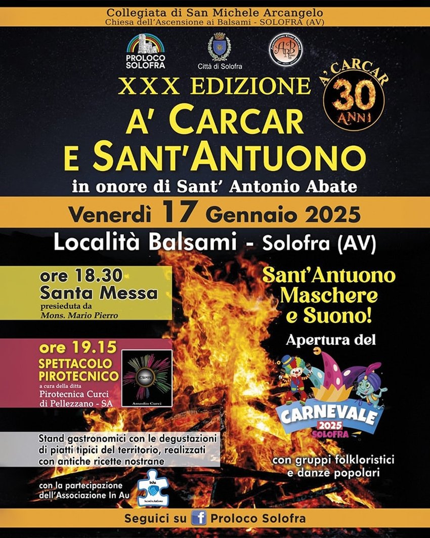 Venerdì 17 Gennaio 2025, in località Balsami di Solofra, una tradizione che si rinnova con la 30esima edizione de "A' Carcar e Sant'Antuono". Alle 18:30, Santa Messa presieduta da mons. Mario Pierro; ore 19:15, spettacolo di fuochi artificiali a cura della Pirotecnica Curci di Pellezzano; a seguire, apertura ufficiale del Carnevale 2025 di Solofra, con la partecipazione di 2 gruppi Zeze e l'energia di gruppi folk e danze popolari.