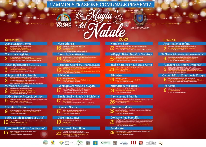 L'8 dicembre, inaugurazione del Villaggio di Babbo Natale "Quel Posto Magico". A seguire, l'avvio dei Mercatini di Natale. Il 16 dicembre la Notte Bianca: negozi aperti e spettacoli nelle vie del centro con artisti di strada, gruppi musicali e il comico Simone Schettino. Non mancano concerti, che vedono i giovani talenti solofrani esibirsi con flauto, chitarra e violino. E poi Teatro di Eduardo De Filippo con "Gennariello".