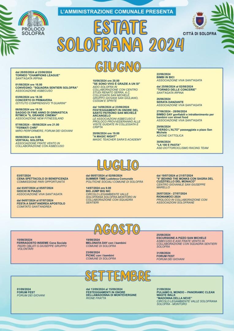 Sport, cultura, divertimento, bimbi e altro. Tiene conto di ogni fascia di età il cartellone per l’estate 2024 allestito dall’Amministrazione Comunale di Solofra, con il contributo prezioso della Pro Loco e delle Associazioni cittadine che rappresentano la linfa vitale della città. "L’opera umana più bella - commenta l'assessore al commercio, Orsola De Stefano - è di essere utili al prossimo".