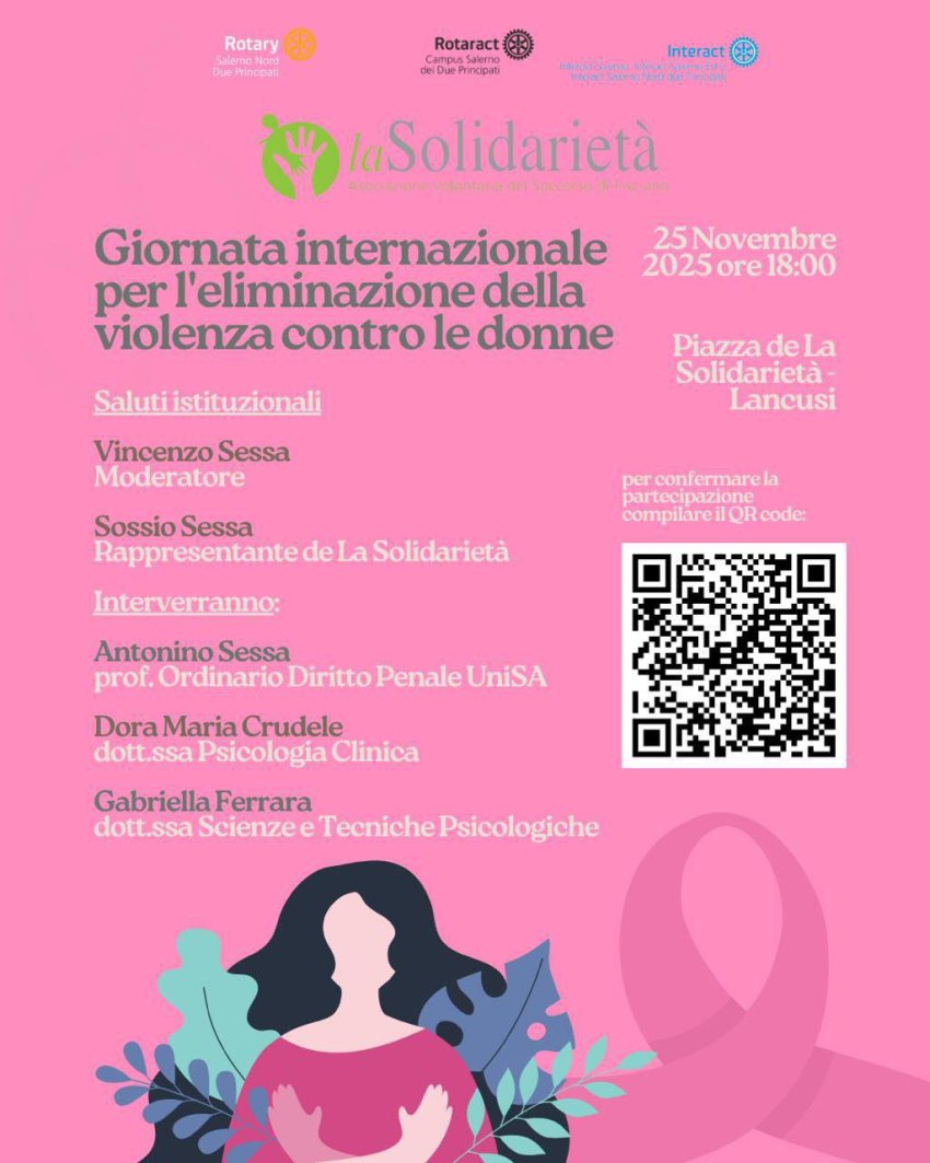 Le parole non bastano. La battaglia contro la violenza sulle donne va affrontata con azioni concrete e strumenti che possano garantire la sicurezza. Su questa linea di pensiero, l’Associazione di Volontariato "La Solidarietà" di Fisciano, il prossimo 25 novembre, alle 18:00, in occasione della "Giornata Internazionale per l’eliminazione della violenza contro le donne", ha organizzato un incontro di sensibilizzazione. Interverranno: il prof. Antonino Sessa, ordinario di Diritto Penale c/o Unisa; la d.ssa Dora Maria Crudele, Psicologa Clinica; Gabriella Ferrara, d.ssa in Scienze e Tecniche Psicologiche.